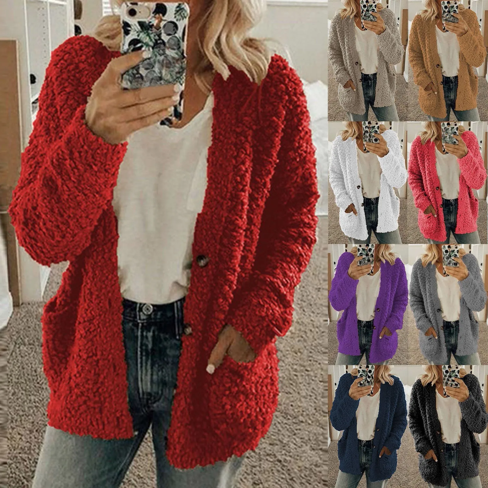 Women Casual Plus Size Plush Sweater Pockets Outerwear Buttons Cardigan Coat