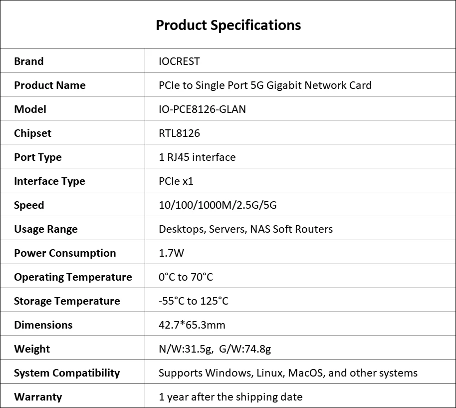 Origin: Mainland China IOCREST 5G PCI-E To RJ45 Network Card RTL8126 Chip Gigabit Ethernet PCI Express Network Card 10/100/2500/5000Mbps 1Gbps/5Gbps